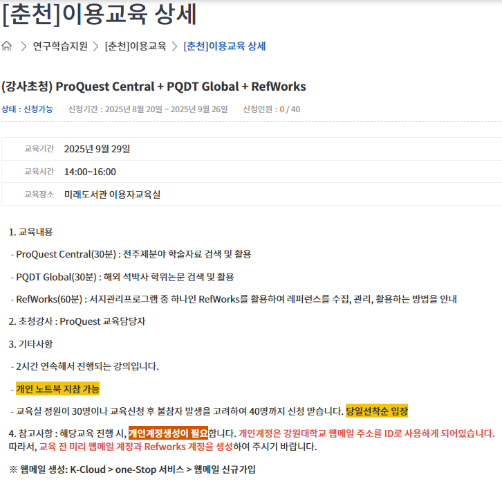 [강사초청] 도서관 이용자 교육 안내(ProQuest Central, PQDT Global, RefWorks)